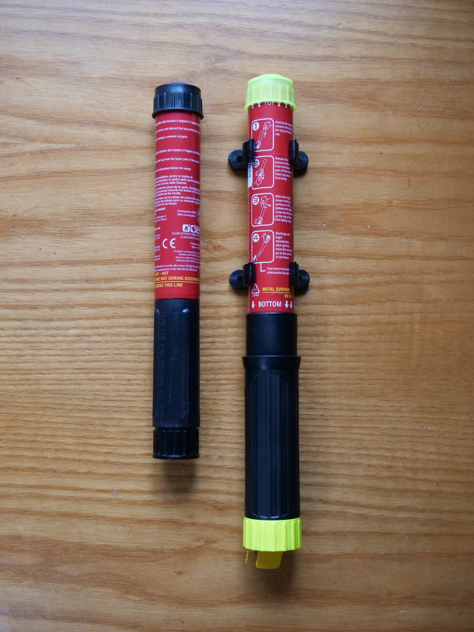 We managed to pick up a couple of fire safety sticks on eBay; we think one is an FSS50. So here it is alongside one of the FSS100 we have bought for the van. The FSS50 will probably be left in the car. No final decision yet.